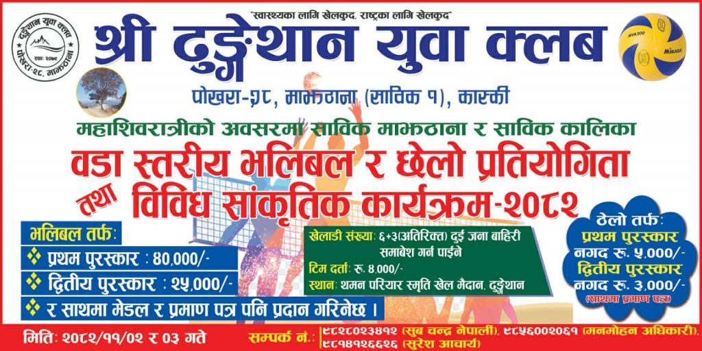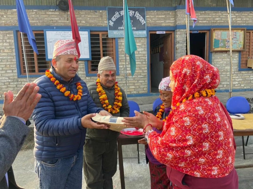 पोखरा / माघ १७ । माछापुच्छ्रे गाउँपालिका, वडा नम्बर ८ स्थित वाराही आधारभूत विद्यालयका विद्यार्थीहरूलाई खेलकुद का लागि ट्रयाक र स्टेसनरी सामग्री वितरण गरिएको छ । पोखरा २९ जनप्रकाश बहुमुखी