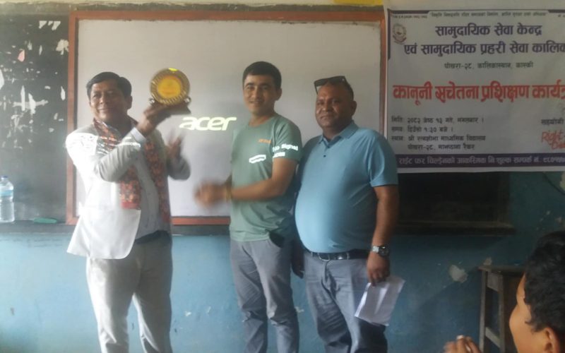 सामुदायिक सेवा केन्द्र तथा सामुदायिक प्रहरी सेवा कालिकाको आयोजनामा एकदिने कानूनी सचेतना प्रशिक्षण मंगलबार सम्पन्न भएको छ। ‘राइट फर चिल्ड्रेन’को विशेष सहयोग तथा रत्नशोभा माध्यमिक विद्यालयको व्यवस्थापनमा सञ्चालित सो कार्यक्रममा विद्यालयका कक्षा ८ देखि १० सम्मका विद्यार्थीहरू एवं अभिभावकहरूलाई लक्षित गरी प्रशिक्षण प्रदान गरिएको विद्यालयका प्रधानाध्यापक किरणबाबु न्यौपानेले जानकारी दिनुभयो।
