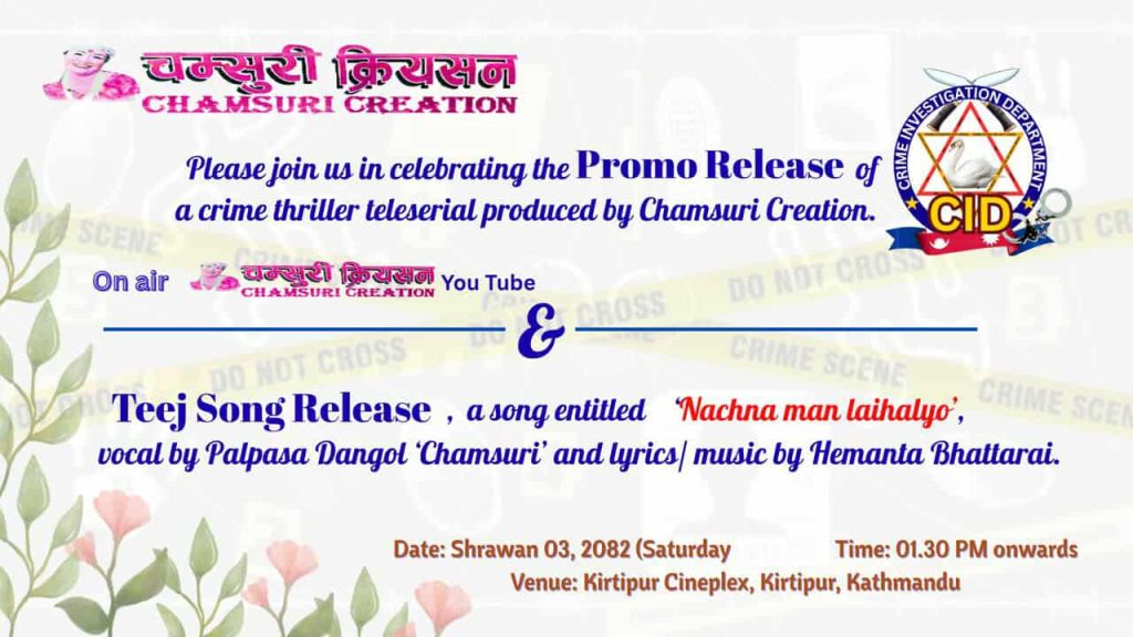 काठमाडौं, श्रावण ३ । चम्सुरी क्रियसनले निर्माण गरेको नयाँ क्राइम थ्रिलर टेलिसिरियलको प्रोमो सार्वजनिक गर्ने भएको छ। चम्सुरी क्रियसन युट्युब च्यानलमार्फत प्रसारण हुने उक्त टेलिसिरियलको प्रोमो श्रावण ३ गते शनिबार काठमाडौको किर्तिपुर सिनेप्लेक्समा विशेष कार्यक्रमबीच सार्वजनिक गरिने कलाकार पल्पसा डंगोल “चम्सुरी ” पल्पसा डंगोलले जानकारी दिनु भयो ।